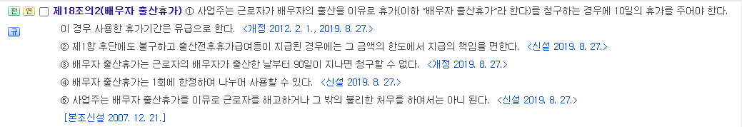 - 2019년 개정된 사항으로는 배우자의 출산 유급휴가가 10일로 확대 되었으며, 1회에 한정하여 분할 사용도 가능하게 되었습니다.