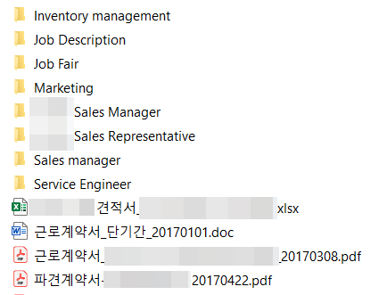 채용 포지션별 폴더 안에는, 채용 진행간 접수된 이력서, 면접 평가서, 그리고 최종 선발된 채용 대상자의 보고서와 근로계약서 등의 채용 절차에 따라 하위 폴더를 정리 했습니다. 예를 들어, 서류전형-면접-처우조율-최종합격-합격자서류 등으로 정리하니, 업무 상 정리가 간결해졌습니다.