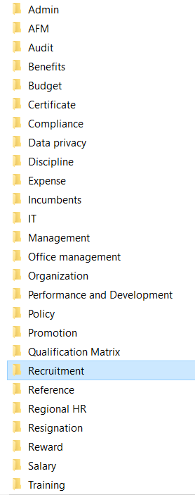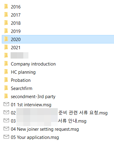 이렇게 정리하고 나면, 매년 진행한 포지션별 특성 파악도 가능하고, 절차별 관리 및 서류 정리가 간편합니다. 인사 업무 특성 상, 대부분 업무가 연속성이 있기에 (가령, 작년 말부터 올해 초까지 진행 중인 채용 건), 연도를 제일 큰 폴더로 분류하는 것 보다는 이 방법이 더 사용하기 용이 했습니다.