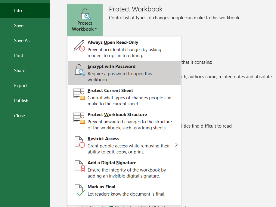 엑셀이나 워드 경우, Info - Protect Workbook - Encrypt with Password에서 비밀번호를 설정하면, 비번을 입력해야만 내용 확인이 가능하기에 행여나 실수로 잘 못 공유한 경우의 사태를 방지할 수 있습니다.