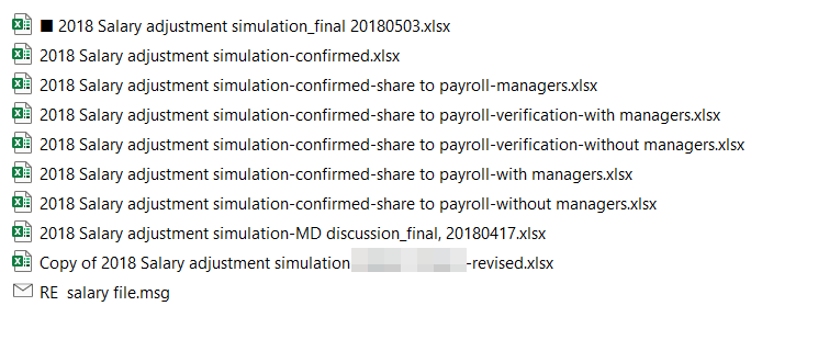 진행 단계는 다양한 방법으로 순서를 표시합니다. HR업무는 대부분 양식 배포, 자료 취합, 제안서, 승인자료, 최종 자료 등의 형태로 많이 정리 되기에, shared, received, proposed, approved, confiremd 등으로 파일명을 작성합니다. 수정 논의가 진행되는 경우, 1안/2안, 혹은 ver01, ver02 등으로 구분하여 과거 자료와 수정된 자료를 계속 비교할 수 있도록 정리해 둡니다.