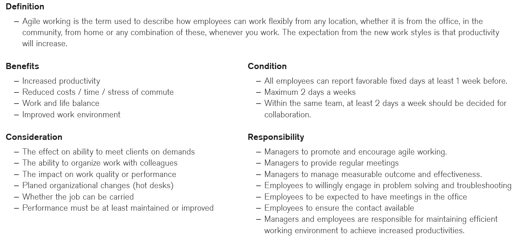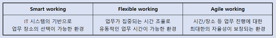 - 정의 : 애자일 워킹은 임직원이 장소와 시간에 구애받지 않고 언제나 어디서나 업무를 할 수 있는 것응 뜻하며, 효율성을 확보하여 생산성이 높아지기를 기대하는 제도로 정의