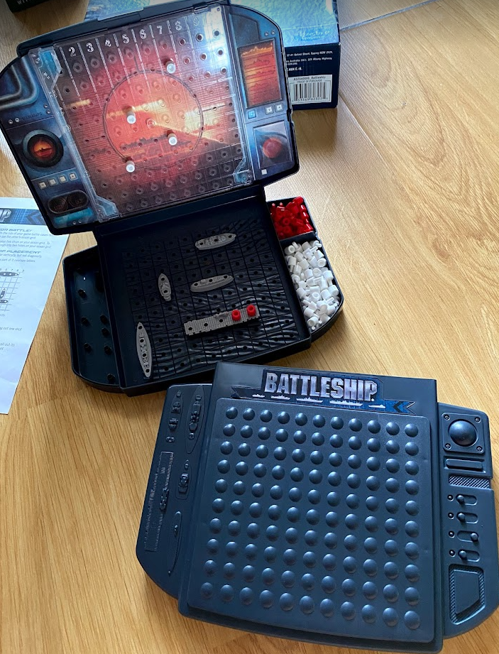 일대일 게임으로, 상대방이 호명한 좌표에 본인 전함이 위치했으면 "Hit (맞았다~!)", 놓쳤다면 "Miss (놓쳤다~!)"를 알려주고, 그로 인해 서로의 배가 어디에 위치해 있는지 먼저 찾는 게임 입니다. 상대방의 위치를 파악 하기 위해 위의 판에는 놓친 곳은 흰색, 맞힌 곳은 빨간색 핀을 꼽고, 본인 배가 맞으면 빨간색으로 표시 합니다. 모니터와 같은 모형과 핀을 이용하다 보니, 보드나 카드 게임과는 색다른 즐거움이 있습니다.