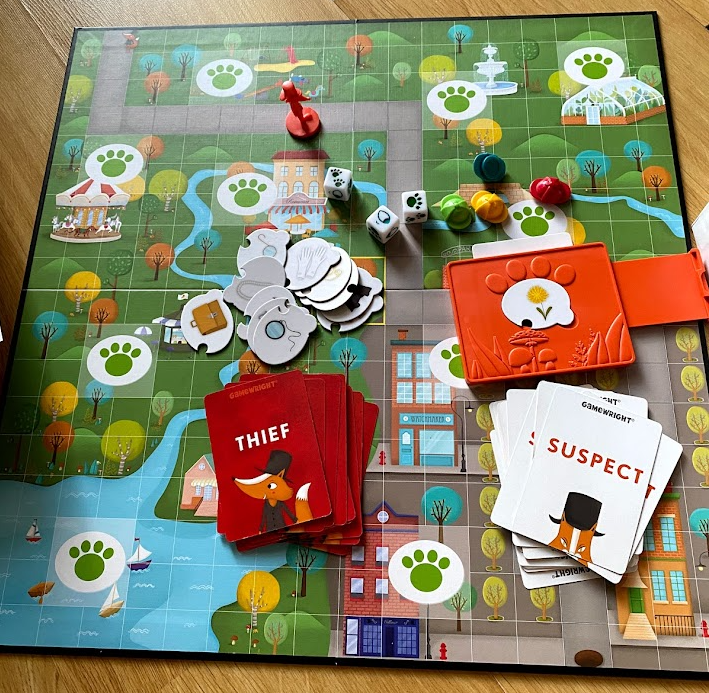 근래 가장 즐기는 협력 추리 게임 입니다. 주사위를 굴려 단서카드를 획득 하거나, 용의자 카드를 확보하고, 단서카드를 오렌지색 필터?에서 확인하고 도둑을 찾는 게임 입니다. 단서카드에 한쪽 면에 구멍이 있는데 녹색이 나오면 용의자가 착용하고 있는 소품이고, 흰색이 나오면 용의자가 가지고 있지 않는 소품 입니다. 단서카드나 용의자카드를 획득하지 못하는 경우 (주사위가 다른 모양이 나오는 경우)에는 여우가 여우굴을 향해 이동하고, 도망 가기 전에 다양한 단서를 확보해서 도둑을 잡아야 합니다. 좀 복잡한 듯 하지만, 다양한 요소를 설명해가며 아이가 생각의 폭을 넓혀가고, 나름대로 추리를 하는 모습을 볼 수 있습니다. 강추 합니다!