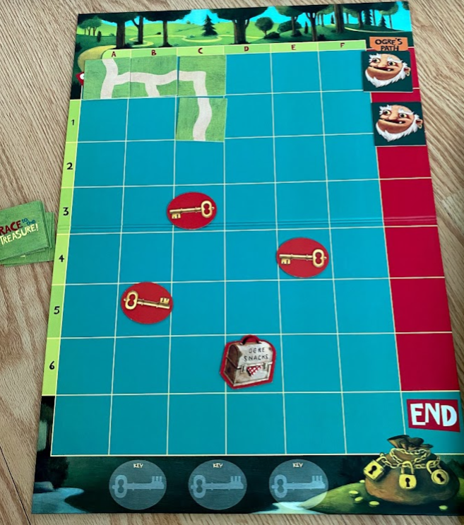 카드를 뒤집어서 나오는 모양으로 길을 연결하고, 오거 카드가 나오면 오른쪽의 오거가 보물을 향해 다가갑니다. 오거가 보물이 닿기 전에 길을 연결해서 보물에 닿아야 하며, 가는 길에 열쇠를 모두 획득해야 이기는 게임 입니다. 운에 달려 있는 게임이긴 하지만, 아이에게는 꽤나 흥미진진한 게임이었던 것 같습니다.