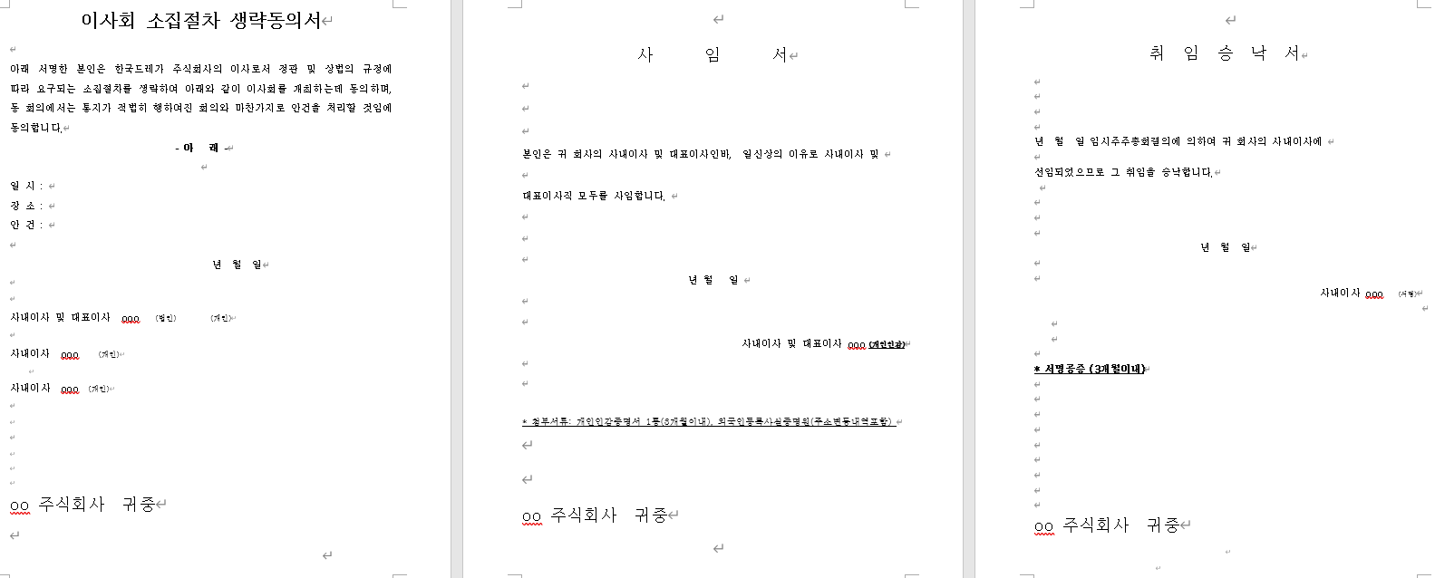 - 이사회 소집절차 생략 동의서 : 대부분 이사회를 진행하지 않고 승인 받은 후 진행하기에 포함하는 서류