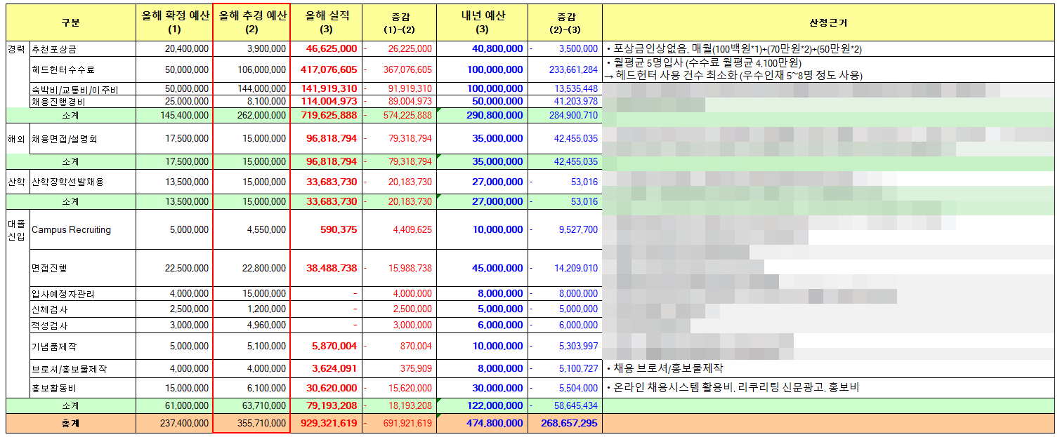 가령, 위 헤드헌터 수수료 경우, 과거 실적 평균 금액과 앞으로의 채용 계획, 예상되는 헤드헌터 사용 계획 등이 설득적이어야만 승인이 가능할 것입니다. 특히나 이런 항목 경우, 비용 감소에 대한 강도높은 압박이 예상되기에 더욱 철저한 준비가 필요 합니다. 캠퍼스리크루팅 경우, 설명을 가렸지만, 예를 들어 1개 학교 방문 시 활동비 (교통비, 식비 등), 홍보물 제작비 등 상세 비용을 계산하여 방문 가능한 학교 수를 반영한 예산 규모를 반영 합니다.