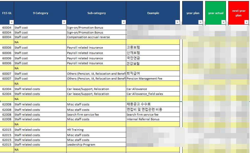 각 필드에 표시된 내역은 재무팀과 연계하여 사용하는 인사팀 관련 상세 계정을 시스템 계정 번호와 함께 모두 작성합니다. 개인적으로 반영되는 급여, 보너스 및 개인별 복지 혜택 비용, 4대 보험 예상 비용 및 사무실 임대료 등 회사 차원에서 발생하는 비용도 각 인원 당 비용으로 반영하여, 총 계정 종류가 약 200여개에 달합니다. 이 모든 내역을 계정별로 정리한 내용이 아래와 같은 형태의 자료 입니다.