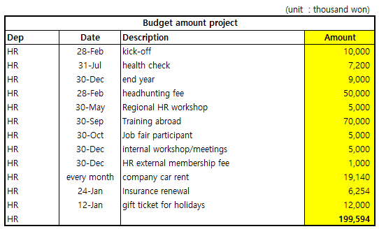 위 예시를 보면, 연간 규칙적으로 진행되는 연초 시무식 (kick-off) 및 연말 송년회 행사, 서치펌 수수료 및 교육 관련 비용, 그리고 취업박람회 참석 등 외부 활동이나 회사 보험 등 내용이 포함되어 있습니다. HR에서 비용집행이 발생하는 수가 소수일 때 발생하는 형태이며, 현 예산 내역에 포함되지 않은 내용, 가령 사무실 임대료나 인건비, 사내 복지비 등은 타 부서에서 관리를 하거나 거의 일정한 금액이 소진되고 있어 특별히 고려되지 않는 것으로 예측도 가능합니다.