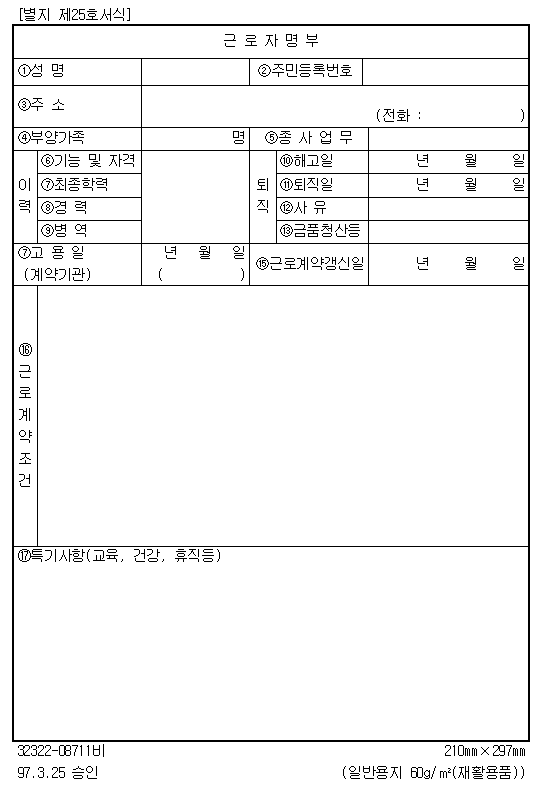 근로자 명부 경우, 따로 저장하는 것 없이 입사 시 이력서로 대체하고 있어서, 오랜 근속으로 자료가 분실된 몇 분의 정보는 아래와 같이 고용노동부에서 안내하는 근로자 명부를 업데이트 해서 준비 했습니다.